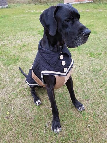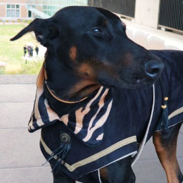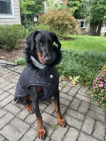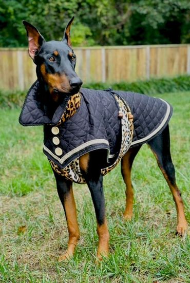 Handsome ANTON ,the Doberman male in his new stylish VALENTINO/black suede coat for the Fall.