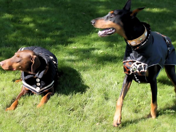 The Doberman girls Bella & Saphira snuggle up in our hand knitted cotton Sweaters
